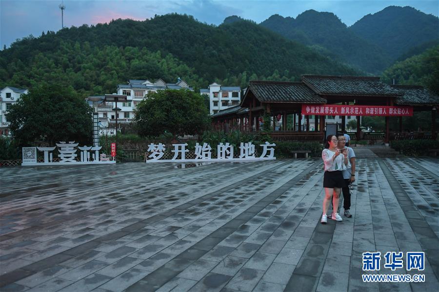游客在下姜村的小廣場游覽(2017年8月9日攝)。