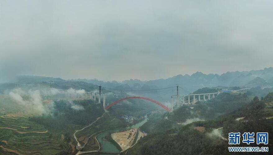 當日,杭瑞高速貴州省畢節(jié)至都格(黔滇界)公路北盤江大橋上云霧繚繞,美景如畫。北盤江大橋主橋跨徑720米,橋面到谷底垂直高度565米。
