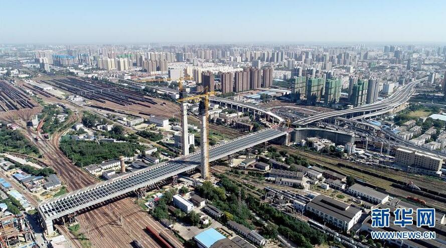9月7日無人機拍攝的鄭北大橋鋼梁頂推施工現(xiàn)場。當日,跨越鄭州北站的鄭北大橋鋼梁頂推成功。鄭北大橋是東西走向的鄭州市農(nóng)業(yè)路快速通道工程的一部分,需跨越鄭州北站。由于列車不能中斷運行,鄭北大橋不能采用常見的搭腳手架方式施工,而是采用頂推法,即在大橋一端把橋身拼接好,然后一段一段朝著鐵路編組站上方送過去,最終完成橋梁架設(shè)。新華社記者朱祥攝
