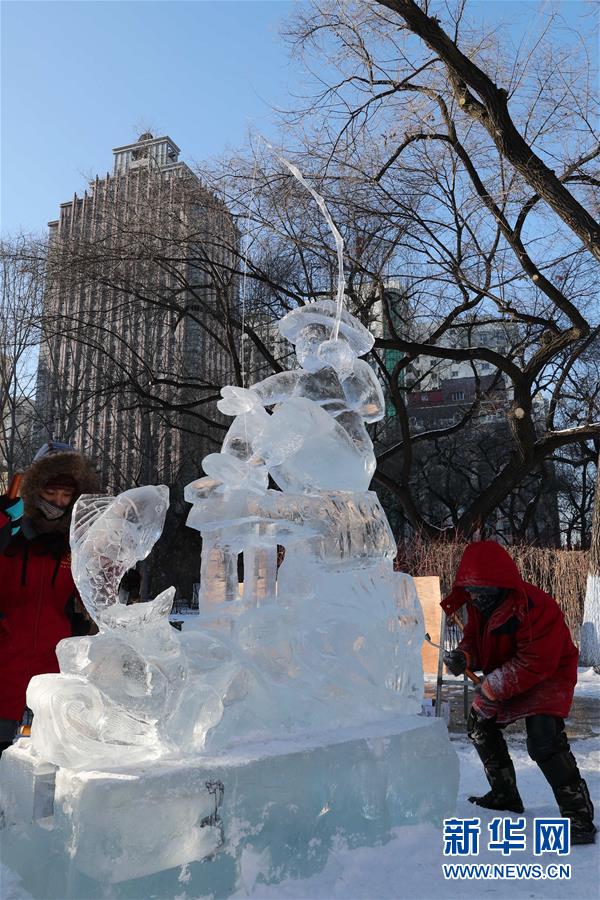 12月27日,選手們?cè)诒荣愔型晟票褡髌贰?當(dāng)日,第十六屆黑龍江省大學(xué)生冰雕藝術(shù)設(shè)計(jì)創(chuàng)作大賽在哈爾濱兆麟公園落下帷幕,全省高校共有99支隊(duì)伍參賽。 新華社記者曹霽陽攝