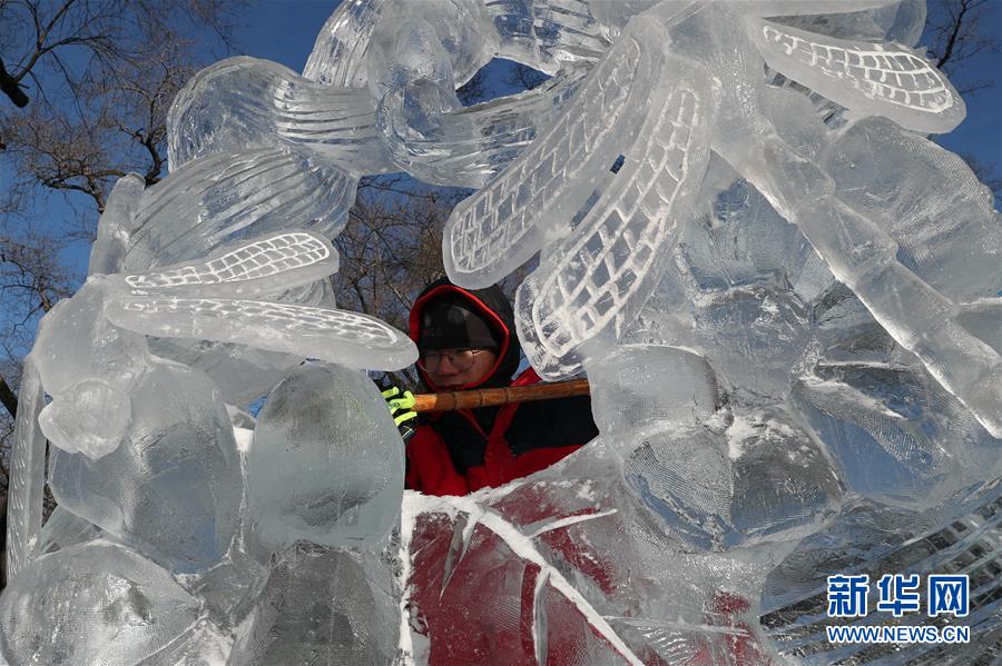 12月27日,選手在比賽中完善冰雕作品。 當(dāng)日,第十六屆黑龍江省大學(xué)生冰雕藝術(shù)設(shè)計創(chuàng)作大賽在哈爾濱兆麟公園落下帷幕,全省高校共有99支隊伍參賽。 新華社記者曹霽陽攝