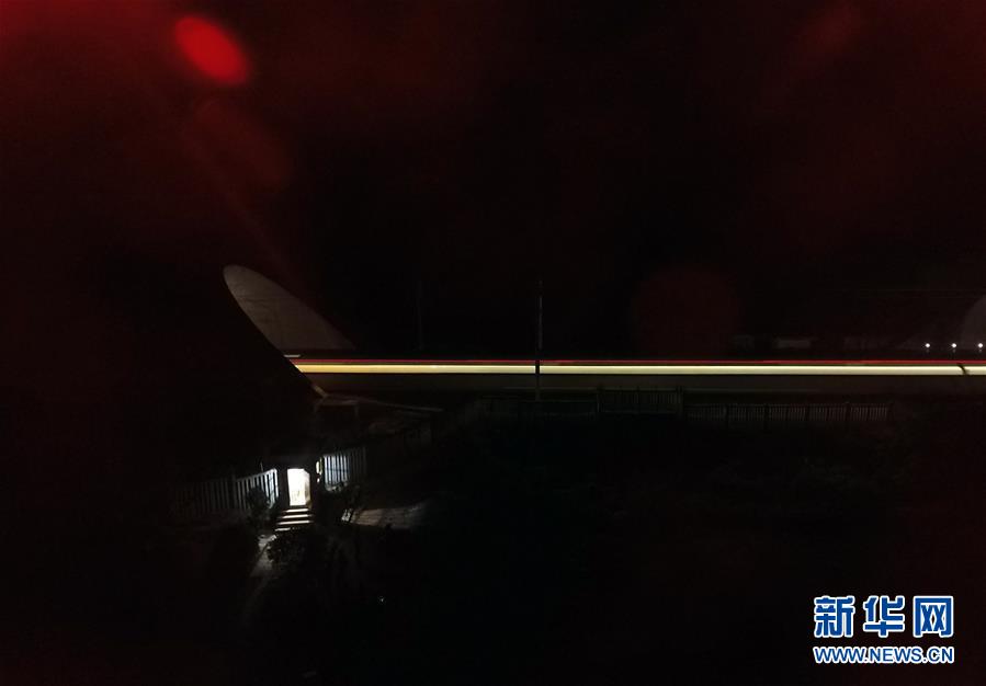 一列動車夜間穿越花甲山隧道進(jìn)入壇柱隧道(左)(2月11日無人機(jī)航拍)。廣西南寧市前往北部灣沿海城市的鐵路,穿越巍巍群山,列車飛馳其間需要穿過大批隧道,僅南寧市到北海市的鐵路隧道就有18個。