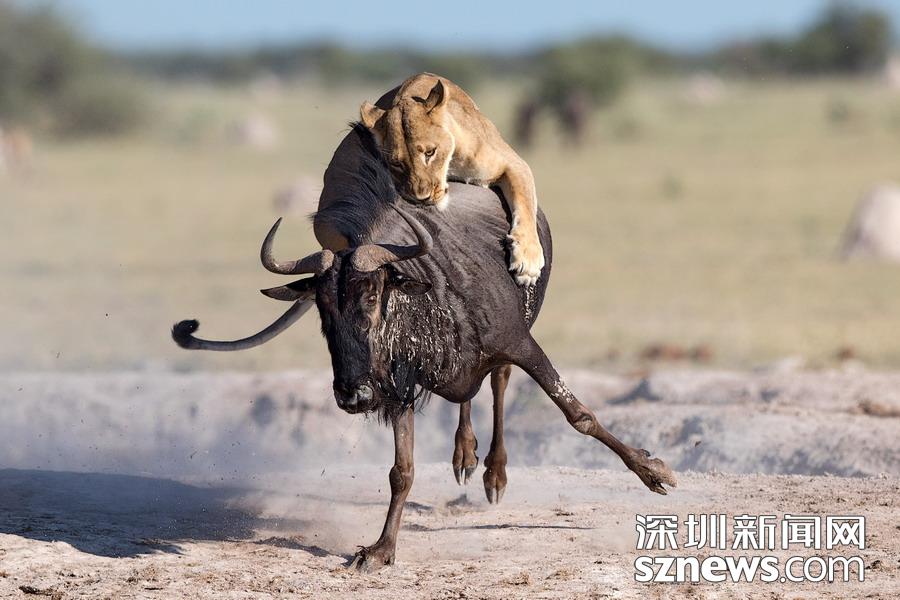 英國攝影師蘇-莫里斯(Sue Morri)在博茨瓦納Nxai Pan國家公園游玩,目睹了一場兇惡母獅獵食角馬的畫面。母獅甚至攀到了角馬背上,想要牢牢遏制住到手的“美餐”。強(qiáng)壯的角馬努力地與母獅抗?fàn)帲吡ο胍W∽约旱男悦?,但最終還是不敵母獅被拿下,最后成了母獅孩子們的盤中餐。