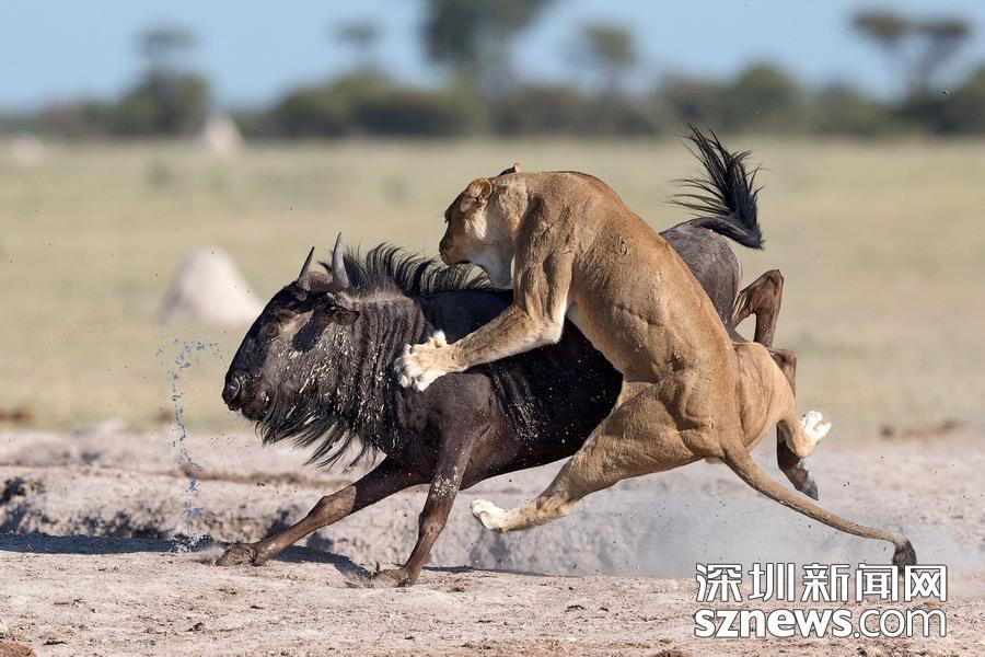 英國(guó)攝影師蘇-莫里斯(Sue Morri)在博茨瓦納Nxai Pan國(guó)家公園游玩,目睹了一場(chǎng)兇惡母獅獵食角馬的畫(huà)面。母獅甚至攀到了角馬背上,想要牢牢遏制住到手的“美餐”。強(qiáng)壯的角馬努力地與母獅抗?fàn)?,竭力想要保住自己的性命,但最終還是不敵母獅被拿下,最后成了母獅孩子們的盤(pán)中餐。