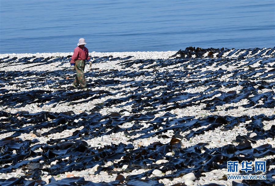 海島居民在大欽島鄉(xiāng)東村的海灘上晾曬海帶(5月23日攝)。新華社記者 朱崢 攝