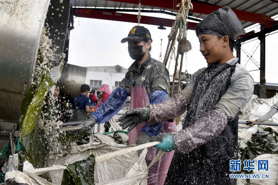 6月5日,在榮成市尋山街道青魚灘村,漁民在加工剛收獲的海帶。 近日,山東省榮成市迎來海帶收獲季。據(jù)悉,榮成市海帶養(yǎng)殖面積14.5萬畝,年產(chǎn)海帶43.3萬噸以上。 新華社記者郭緒雷攝