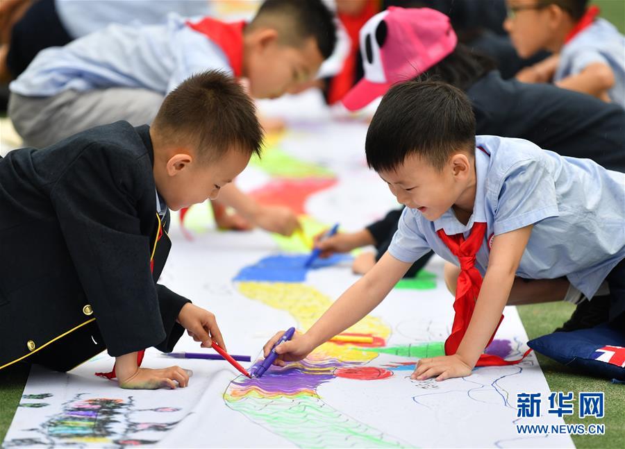 6月5日,陜西師范大學附屬小學的學生在長卷上畫龍舟。新華社記者 張博文 攝