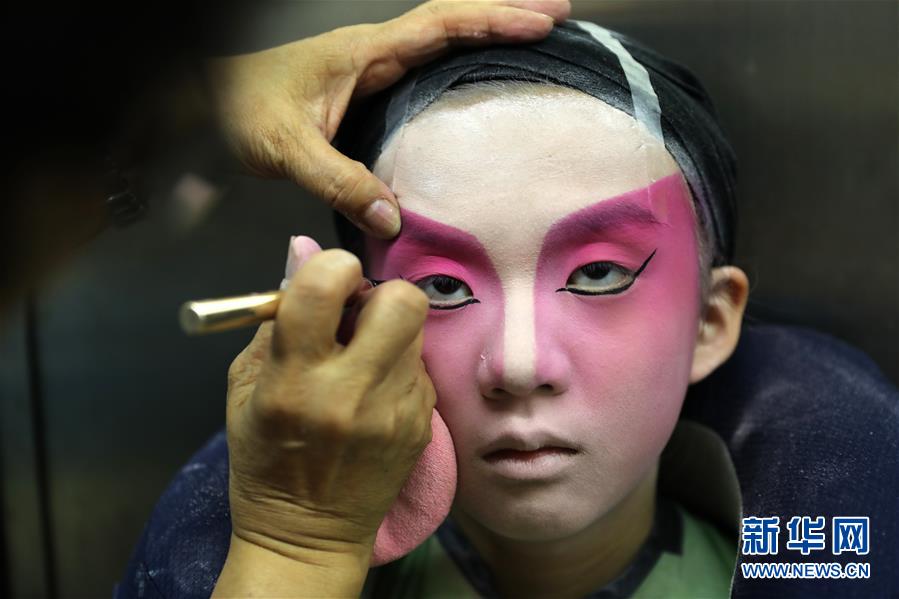粵劇小演員陸瑞徽在畫經(jīng)典“紅白臉”妝容(6月8日攝)。 聲輝粵劇推廣協(xié)會(huì)成立于2003年,是香港重要粵劇藝術(shù)團(tuán)體之一,致力于向青少年推廣粵劇。協(xié)會(huì)目前有兩個(gè)初班,3個(gè)中班,一個(gè)青少年班?;泟∮址Q“廣東大戲”,表演技藝包括“唱做念打”,即唱功、身段、臺(tái)詞、武打,主要流行于廣東、廣西和香港、澳門等地區(qū)。2009年,粵劇被列入聯(lián)合國(guó)教科文組織人類非物質(zhì)文化遺產(chǎn)代表作名錄,今年正逢十周年。 新華社記者 吳曉初 攝