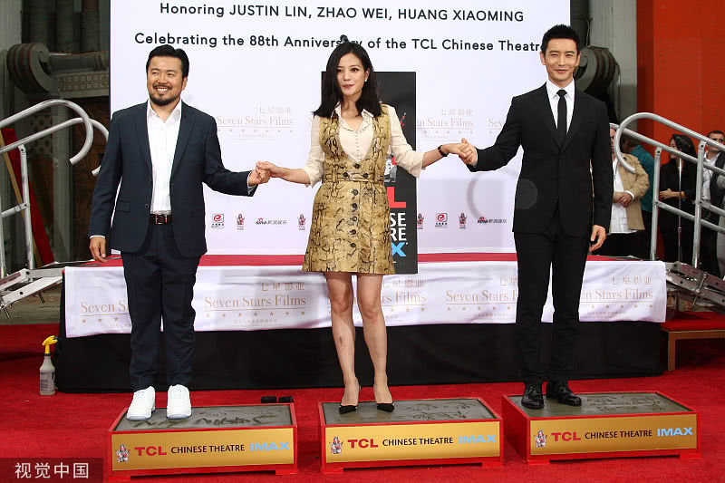 趙薇和黃曉明在好萊塢TCL中國(guó)大劇院門前按下象征世界電影人無(wú)上榮譽(yù)的手印,在該地留印的華人明星只有三個(gè),分別是成龍、吳宇森和馮小剛。