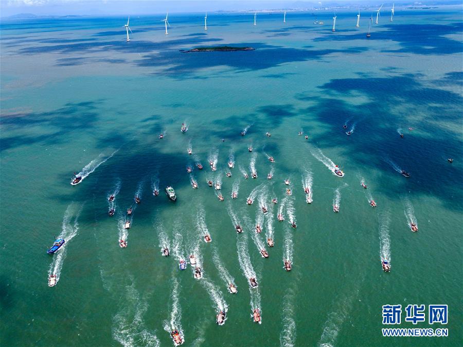 8月3日,在首屆福清開漁節(jié)上,漁船駛向大海(無人機(jī)拍攝)。新華社記者姜克紅攝