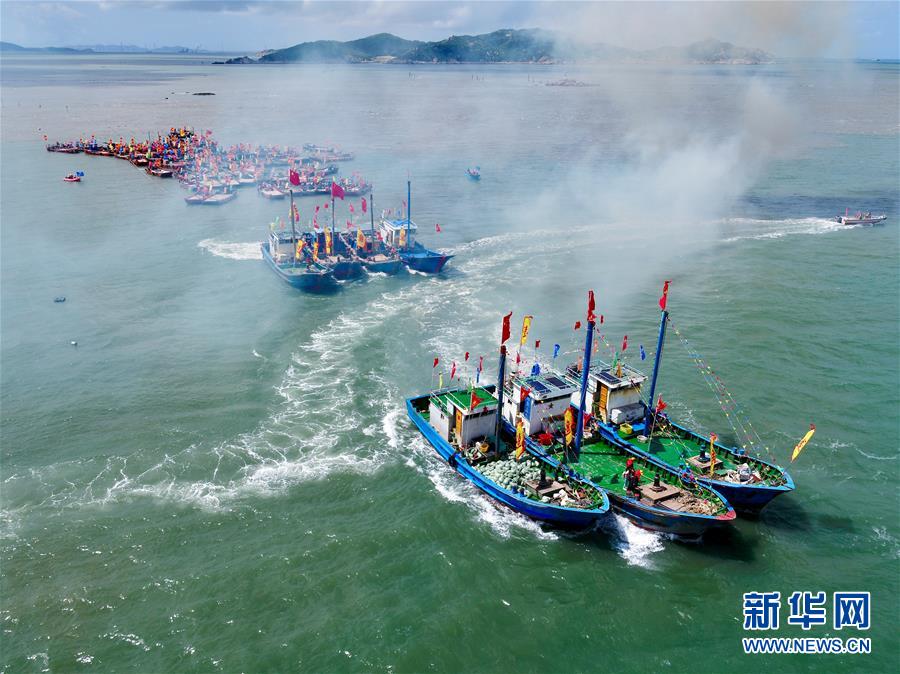 8月3日,在首屆福清開漁節(jié)上,漁船駛向大海(無人機(jī)拍攝)。新華社記者姜克紅攝