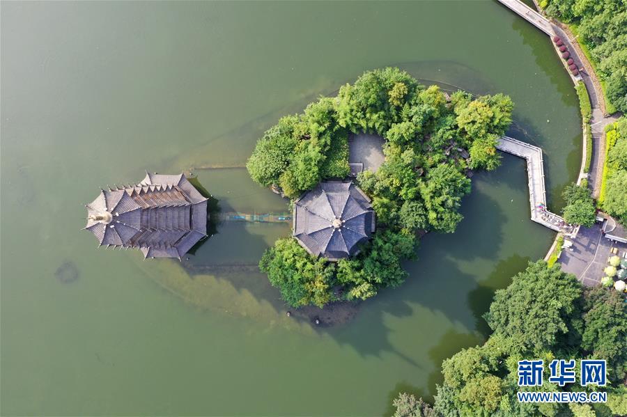 桂林市杉湖景觀(7月1日無(wú)人機(jī)拍攝)。 夏日時(shí)節(jié),廣西桂林市區(qū)內(nèi)的榕湖、杉湖、桂湖、木龍湖等地綠樹(shù)成蔭、景色迷人。 新華社記者陸波岸攝