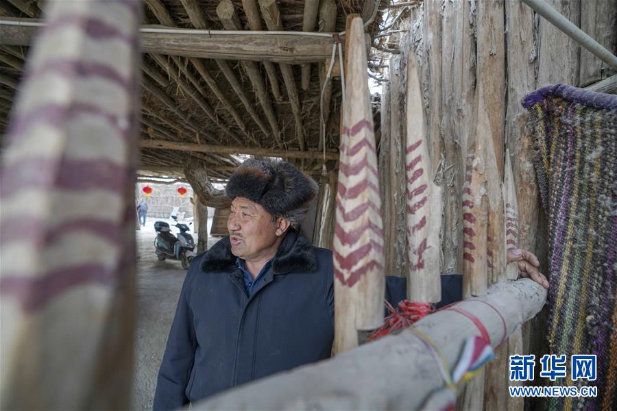 阿木東·艾不東在羅布人村寨的家里(1月29日攝)。他家的裝修都突出了當?shù)匚幕?。新華社記者 趙戈 攝