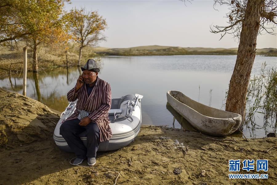 在羅布人村寨,阿木東·艾不東坐在湖邊接電話(2018年10月16日攝)。在旅游旺季,游客會通過電話提前向阿木東預約羅布烤魚。新華社記者 趙戈 攝