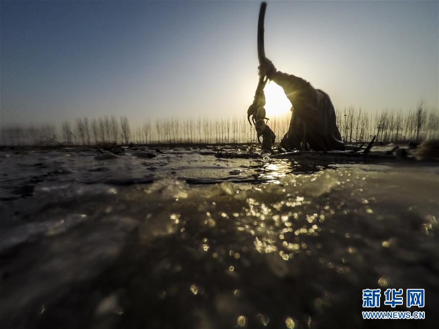 2月1日,在雄安新區(qū)安新縣東向陽(yáng)村的一處藕塘,挖藕工將塘面結(jié)的冰用電鋸切成小塊后挪開。新華社記者沈伯韓攝