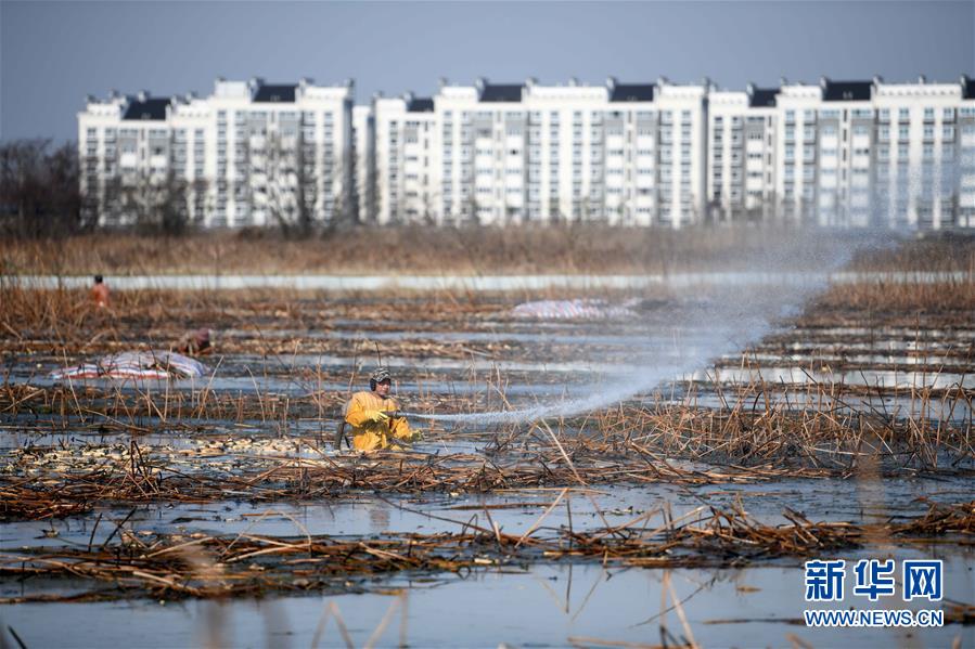來(lái)自淮南的挖藕人張作志在肥西縣豐樂鎮(zhèn)一蓮藕種植基地用高壓水槍沖掉冰層。新華社記者劉軍喜攝