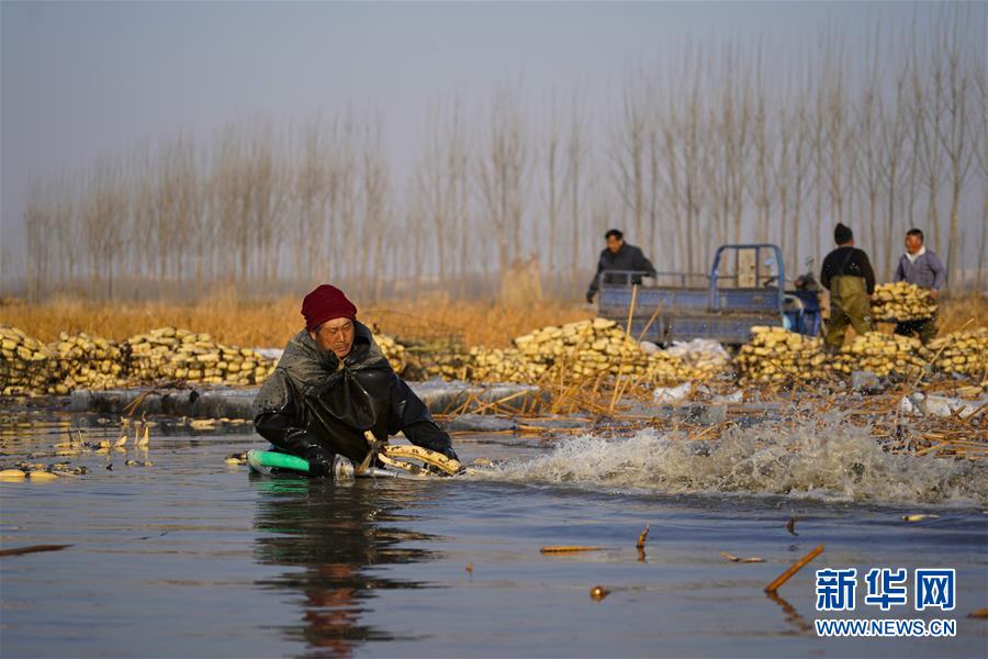 1月31日,在雄安新區(qū)安新縣東向陽(yáng)村的一處藕塘,挖藕工將挖出來(lái)的藕洗干凈后裝車運(yùn)走。新華社記者沈伯韓攝