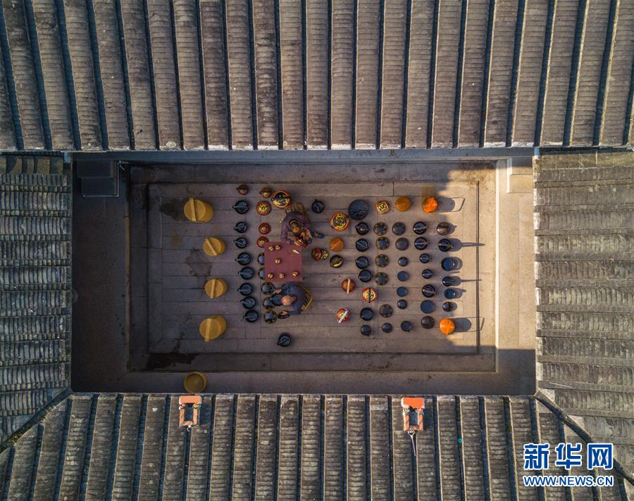 在福建省永春縣仙夾鎮(zhèn)龍水村,村民在老宅制作當?shù)靥厣峄@(1月28日無人機拍攝)。 新華社記者 宋為偉 攝