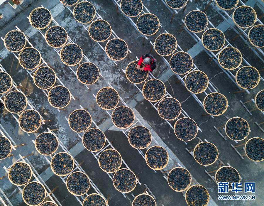在福建省永春縣岵山鎮(zhèn)茂霞村熟地文創(chuàng)園,村民在晾曬用當(dāng)?shù)貍鹘y(tǒng)手藝制作的藥材——熟地(1月28日無(wú)人機(jī)拍攝)。  新華社記者 宋為偉 攝