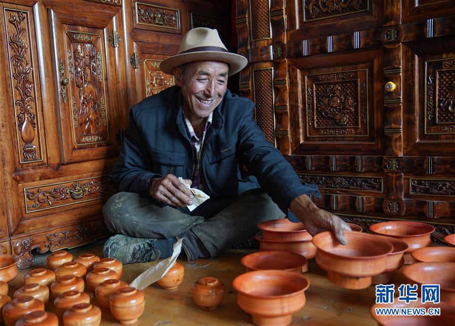 乃村村民次旺多吉在擦拭自己新近制作的木碗(8月26日攝)。新華社記者 多吉占堆 攝
