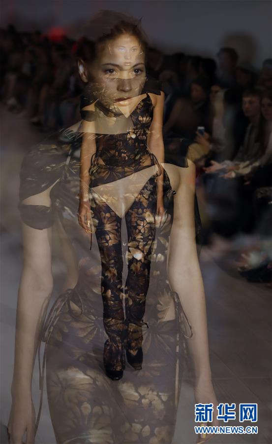 9月17日,在英國倫敦,模特在2020倫敦春夏時裝周上展示Charlotte Knowles品牌服飾(多重曝光)。 當(dāng)日,2020倫敦春夏時裝周落幕。 新華社記者 韓巖 攝