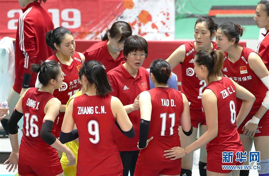 9月23日,中國(guó)隊(duì)主教練郎平(中)在比賽間隙指導(dǎo)球員。當(dāng)日,在日本札幌舉行的2019年女排世界杯賽第二階段A組循環(huán)賽中,中國(guó)隊(duì)以3比0戰(zhàn)勝美國(guó)隊(duì)。新華社記者杜瀟逸攝
