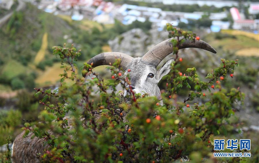 一只巖羊在西藏山南市洛扎縣色鄉(xiāng)海拔4000米左右的盤山路邊,悠閑地吃著野果青草(9月22日攝)。新華社記者 晉美多吉 攝