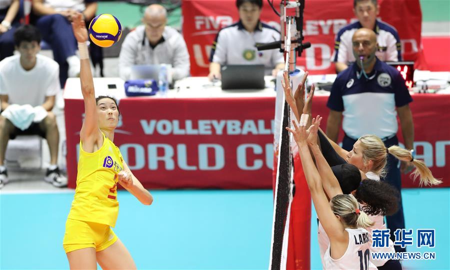 9月23日,中國(guó)隊(duì)球員朱婷(左)在比賽中扣球。當(dāng)日,在日本札幌舉行的2019年女排世界杯賽第二階段A組循環(huán)賽中,中國(guó)隊(duì)以3比0戰(zhàn)勝美國(guó)隊(duì)。新華社記者杜瀟逸攝