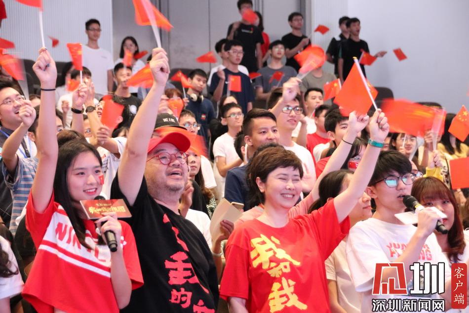 導(dǎo)演張一白和薛曉路和深圳大學(xué)學(xué)子揮舞五星紅旗,唱響電影主題曲。