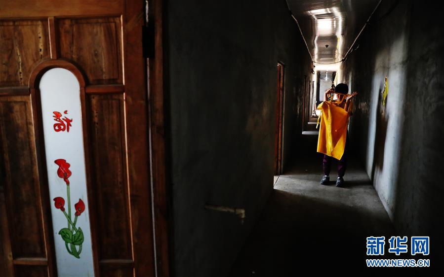 郭旗穿上工作服準備去魚棚(9月6日攝)。 新華社記者 楊青 攝