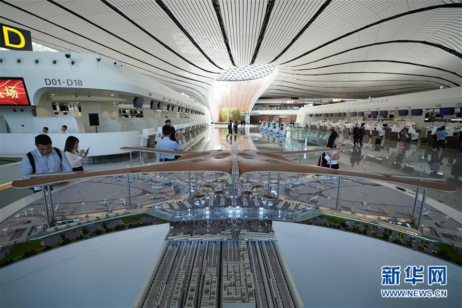 9月25日拍攝的在北京大興國(guó)際機(jī)場(chǎng)航站樓內(nèi)擺放的機(jī)場(chǎng)航站樓模型。新華社記者鞠煥宗攝