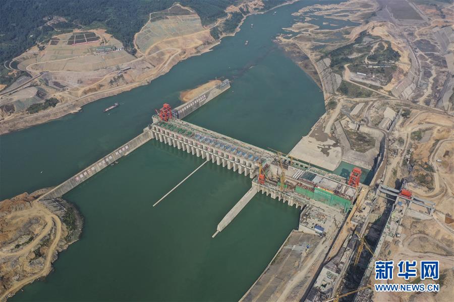 建設(shè)中的大藤峽水利樞紐工程(10月6日無人機拍攝)。節(jié)日期間,工人們在位于廣西桂平市西江流域黔江河段的大藤峽水利樞紐工程現(xiàn)場加緊施工。新華社記者曹祎銘攝
