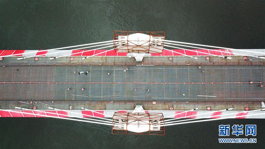 正在進(jìn)行橋面鋪裝施工作業(yè)的黑河到布拉戈維申斯克黑龍江(阿穆爾河)大橋(8月19日無人機(jī)拍攝)。新華社記者 王建威 攝