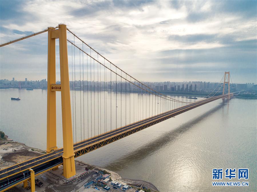楊泗港大橋建設(shè)創(chuàng)造了多項世界之最:一是主橋跨度達(dá)1700米,為世界上跨度最大的雙層懸索橋;二是主橋設(shè)置雙層雙向12車道,是世界上通行能力最大的公路橋梁;三是大橋主纜設(shè)計張力6.5萬噸,采用了世界上強(qiáng)度等級最高的主纜鋼絲;四是大橋設(shè)置機(jī)動車道、非機(jī)動車道、人行觀光道,集過江交通與觀光于一體,是長江上功能最完備的橋梁。新華社記者熊琦攝