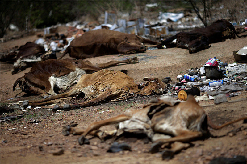 當?shù)貢r間2017年2月12日,巴西帕拉伊巴,路上躺著牛的尸體。