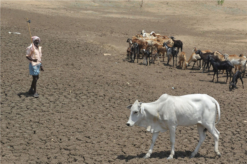 當?shù)貢r間2017年5月30日,印度特倫甘納,印度農(nóng)民在干涸的河床上放羊和牛。NOAH SEELAM/視覺中國 編輯/陳進