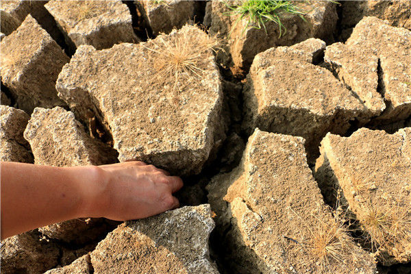 當?shù)貢r間2016年5月13日,柬埔寨甘丹省,受厄爾尼諾現(xiàn)象影響,當?shù)卦庥龈珊堤鞖?,池塘干涸開裂。