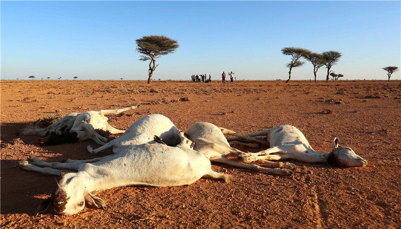 當?shù)貢r間2016年12月15日,索馬里邦特蘭,干旱的土地上散布著羊的尸體。當?shù)卦庥龈珊堤鞖?,牲畜受到危害?br/>