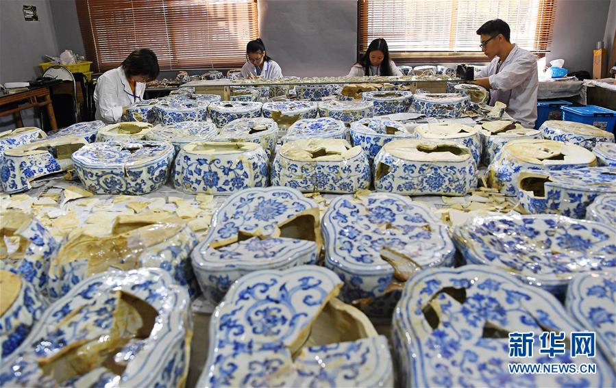 在江西景德鎮(zhèn)御窯廠(chǎng)遺址,工作人員在修復(fù)明代瓷枕(2018年9月20日攝)。新華社記者 萬(wàn)象 攝