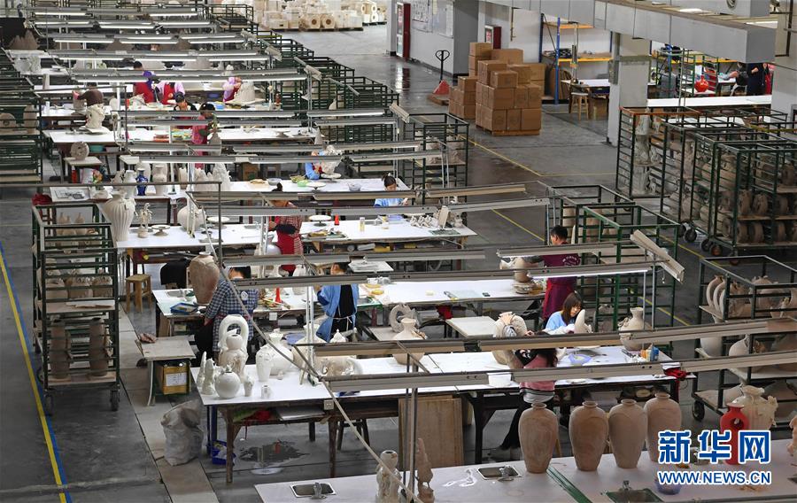 在江西景德鎮(zhèn)法藍(lán)瓷實(shí)業(yè)有限公司,工人們?cè)谔沾缮a(chǎn)車(chē)間工作(2017年4月8日攝)。新華社記者 萬(wàn)象 攝