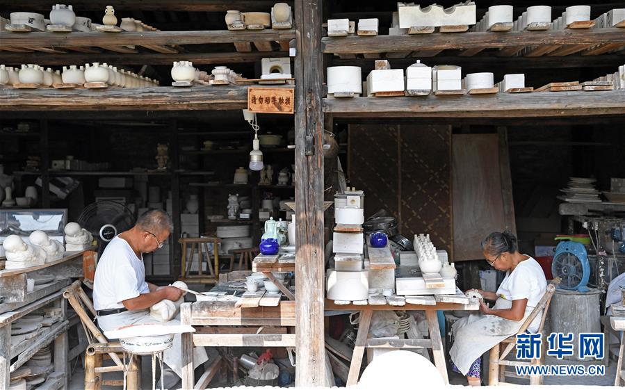 在江西景德鎮(zhèn)御窯廠(chǎng)遺址附近的一處老窯廠(chǎng)內(nèi),工匠們?cè)谥谱鞔善鳎?018年9月20日攝)。新華社記者 萬(wàn)象 攝