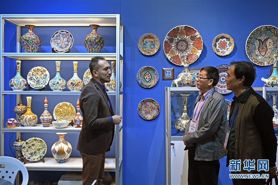 在中國(guó)景德鎮(zhèn)國(guó)際陶瓷博覽會(huì)的現(xiàn)場(chǎng),來(lái)自土耳其的參展商(左一)與參觀者交流(2018年10月18日攝)。新華社記者 萬(wàn)象 攝