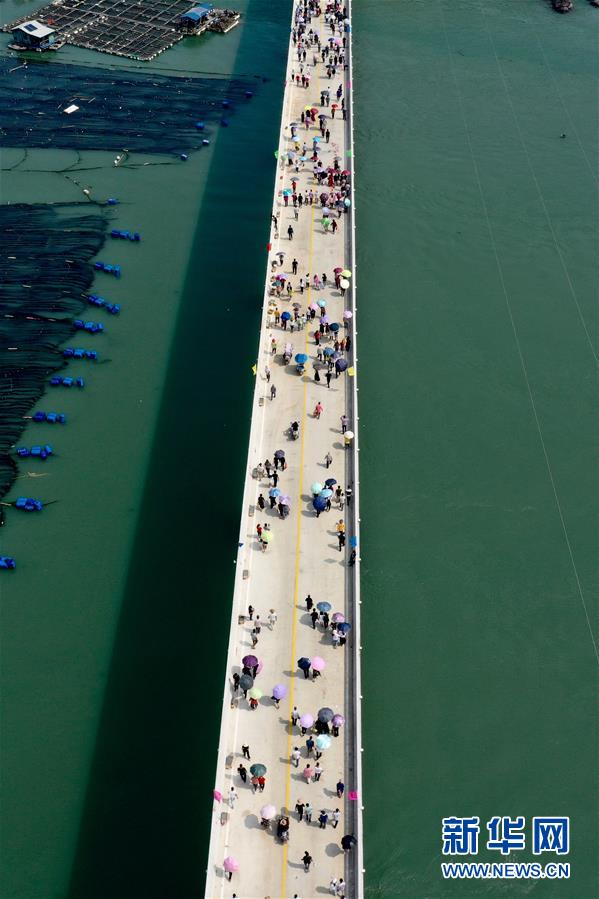 10月12日,福建省霞浦縣東安島海防大橋正式通車,這是當?shù)厝罕娮咴谛聵蛏希o人機拍攝)。新華社記者姜克紅攝