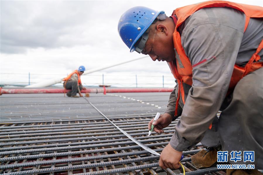 工人在大橋上進行橋面鋪裝施工作業(yè)(8月19日攝)。新華社記者王建威攝