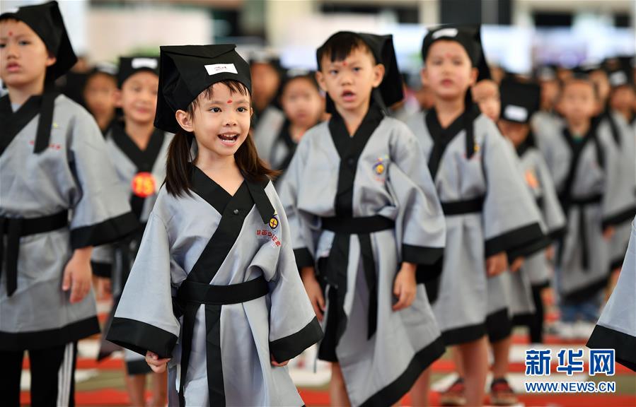 10月13日,參加儀式的小朋友在誦讀《三字經(jīng)》。當(dāng)日,??诤嬌賰核囆g(shù)中心為500名小朋友舉行“開筆禮”,通過“點(diǎn)朱砂,啟智慧”“習(xí)書法,描人字”等儀式讓孩子們體驗(yàn)中國傳統(tǒng)文化。新華社記者郭程攝