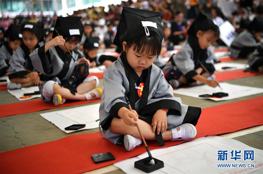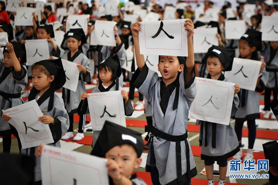 10月13日,參加儀式的小朋友在書寫“人”字。當(dāng)日,??诤嬌賰核囆g(shù)中心為500名小朋友舉行“開筆禮”,通過“點(diǎn)朱砂,啟智慧”“習(xí)書法,描人字”等儀式讓孩子們體驗(yàn)中國傳統(tǒng)文化。新華社記者郭程攝