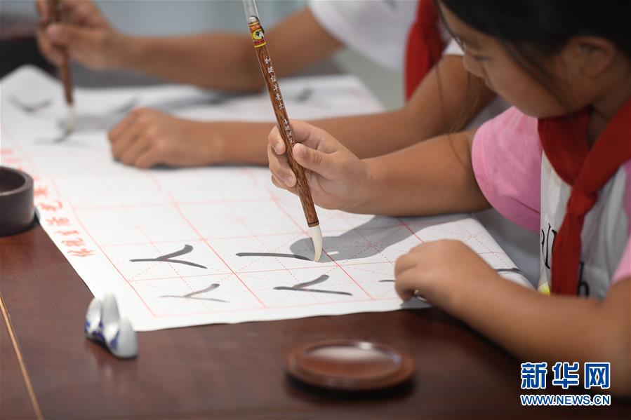 10月14日,小學生在非遺活態(tài)傳承館使用湖筆練習書法。 新華社記者 黃宗治 攝