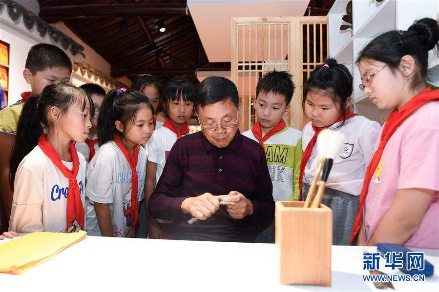 10月14日,湖筆制作技藝國家級(jí)代表性傳承人邱昌明(右四)在非遺活態(tài)傳承館展示湖筆制作的擇筆技能。 新華社記者 黃宗治 攝