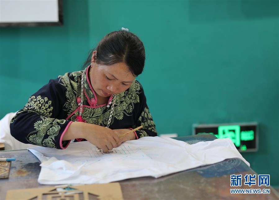 7月2日,苗族婦女王尖其在丹寨萬達小鎮(zhèn)展示苗族蠟染技藝。新華社記者歐東衢攝