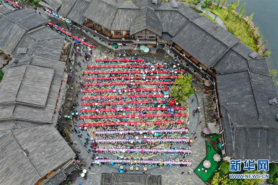丹寨縣萬達小鎮(zhèn)萬人長桌宴(10月26日無人機拍攝)。
